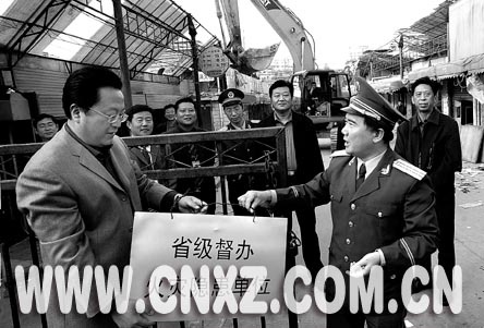 11月8日下午,省級(jí)督辦、市級(jí)掛牌的我市重大火災(zāi)隱患單位宣武市場,由于其東市場的整體拆除而摘下了警示牌。這是我市歷史上第一次對重大火災(zāi)隱患部位實(shí)施整體拆除。明年,一個(gè)現(xiàn)代化的新市場將在原址建成。